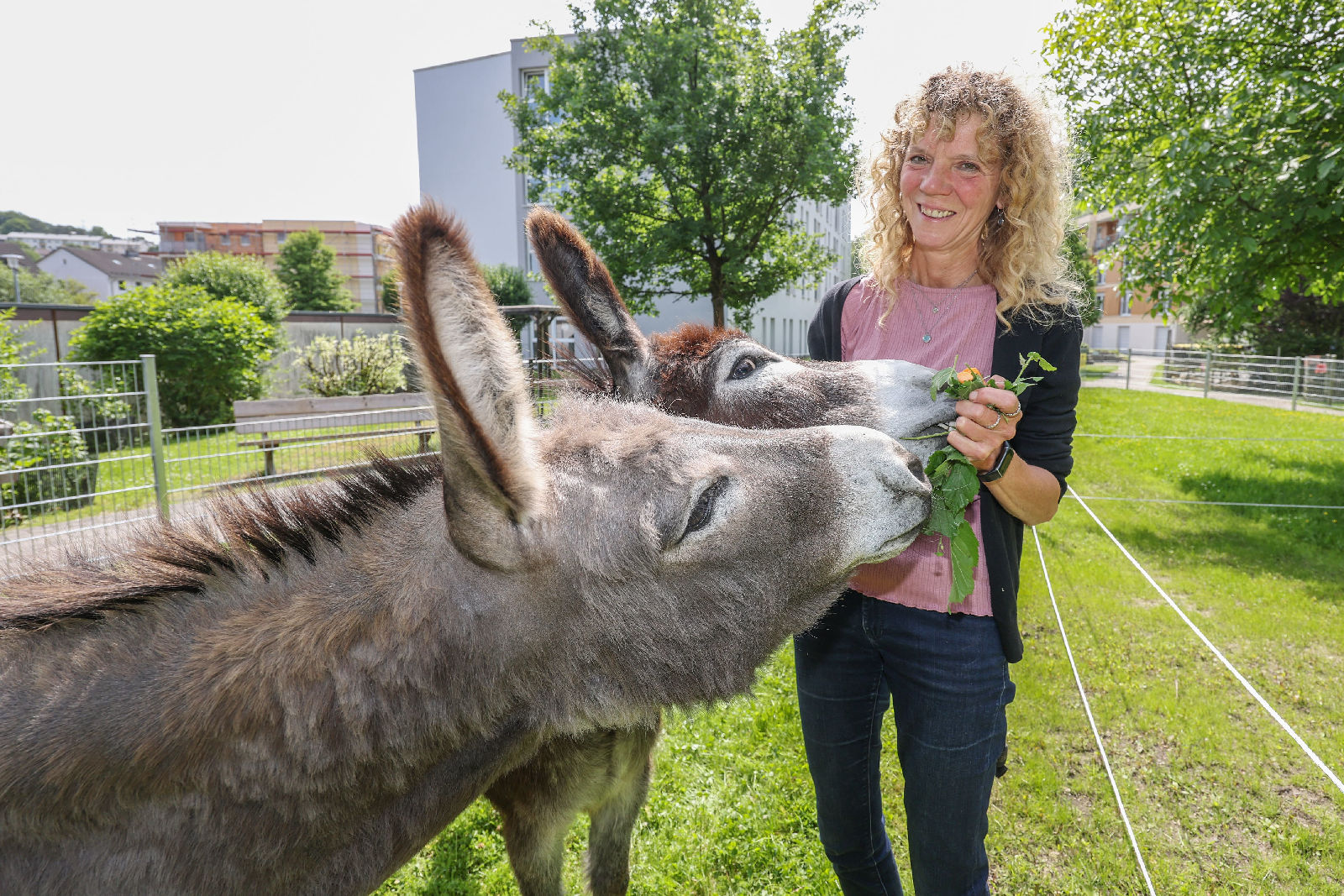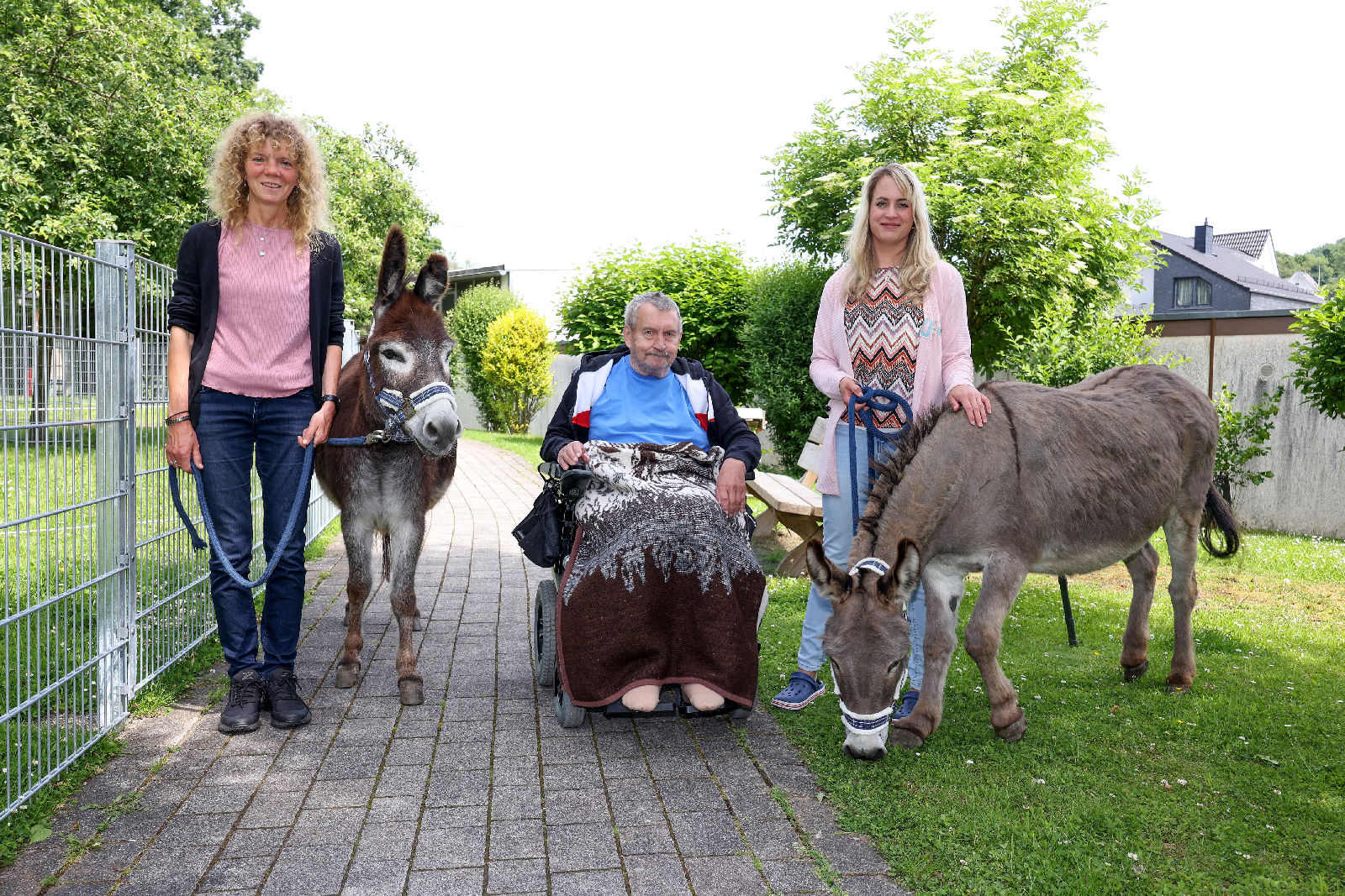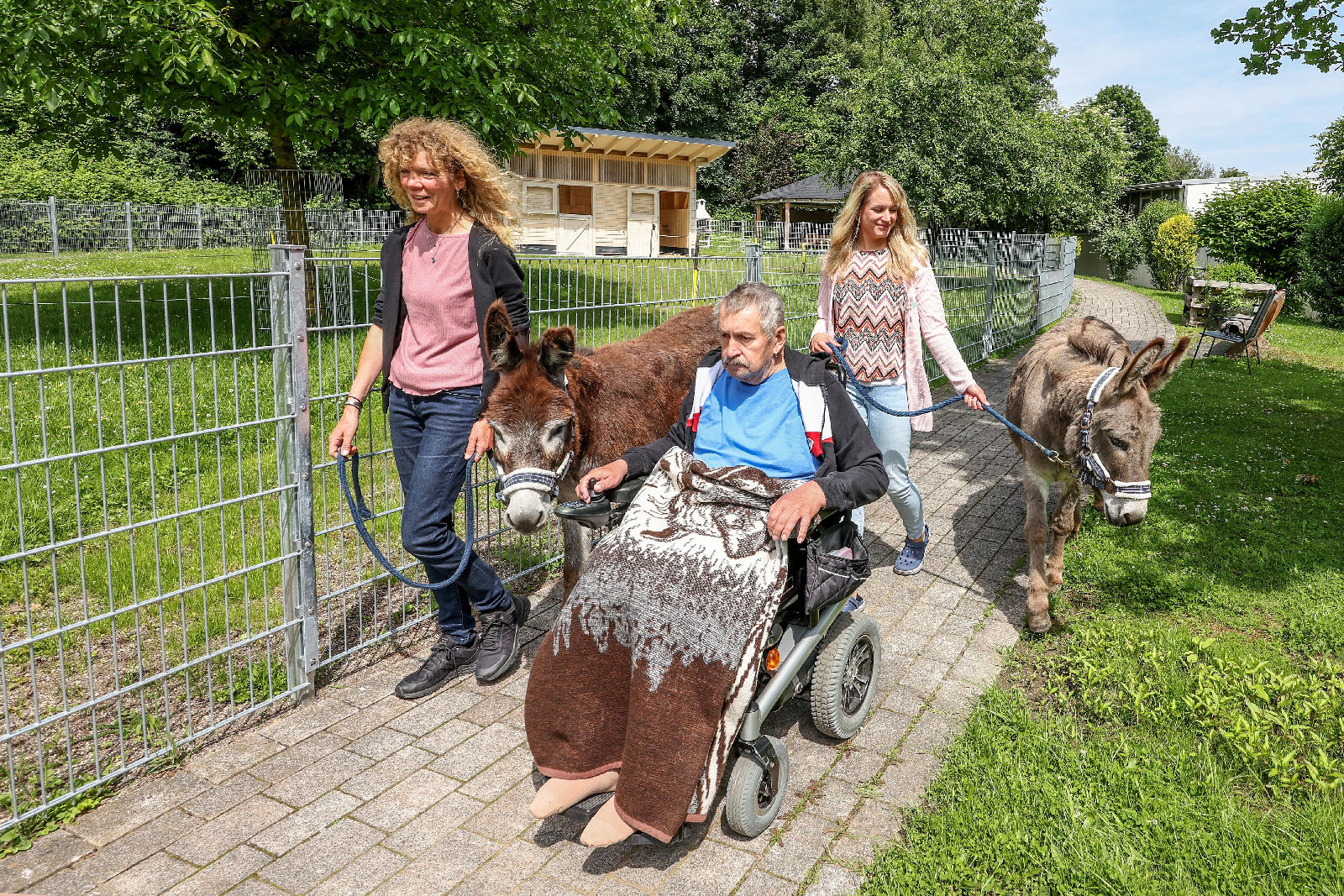 Die Tiere laden einfach ein zur Bewegung, die Bewohner laufen mit ihren Rollatoren und Rollstühlen auf dem Rundweg um die Ställe und Gehege.